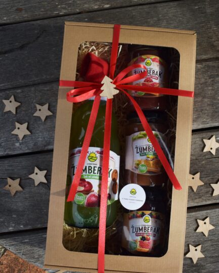 Poklon paket sadrži: matični sok od aronije 1l, sirup od aronije 0.7l, džem od aronije 220g, čaj od aronije 100g, u poklon kutiji s prozorčićem, slamicom, ukrasnom trakicom i božićnim ukrasom.